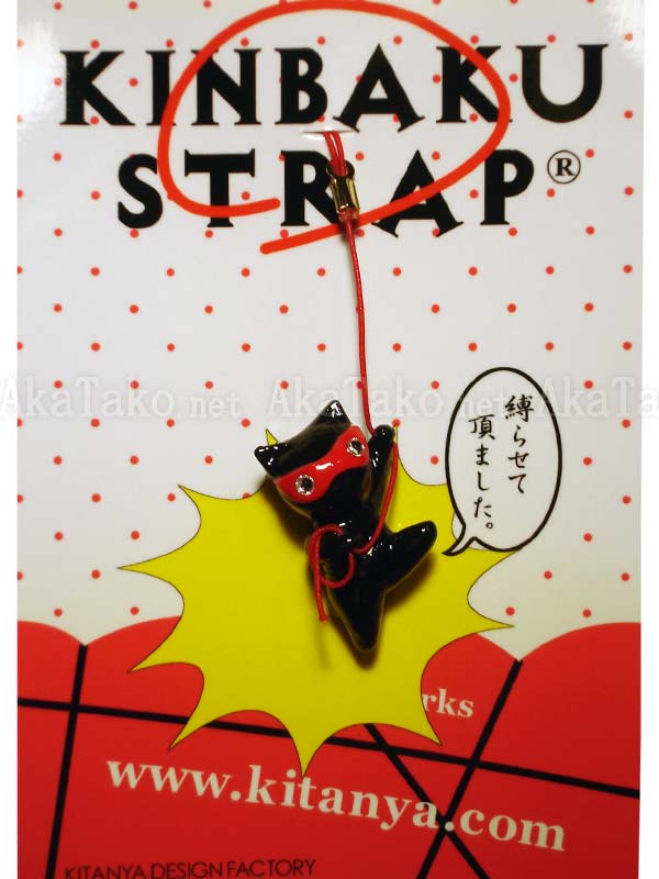 The black cat is ready to be the rope master tonight with his lasso of red rope. Someone has to tie up all those bunnies and pretty ladies! Kinbaku cell phone strap handmade in Japan and signed by the artist (in red on back). Comes on a paper display card as shown in second photo.