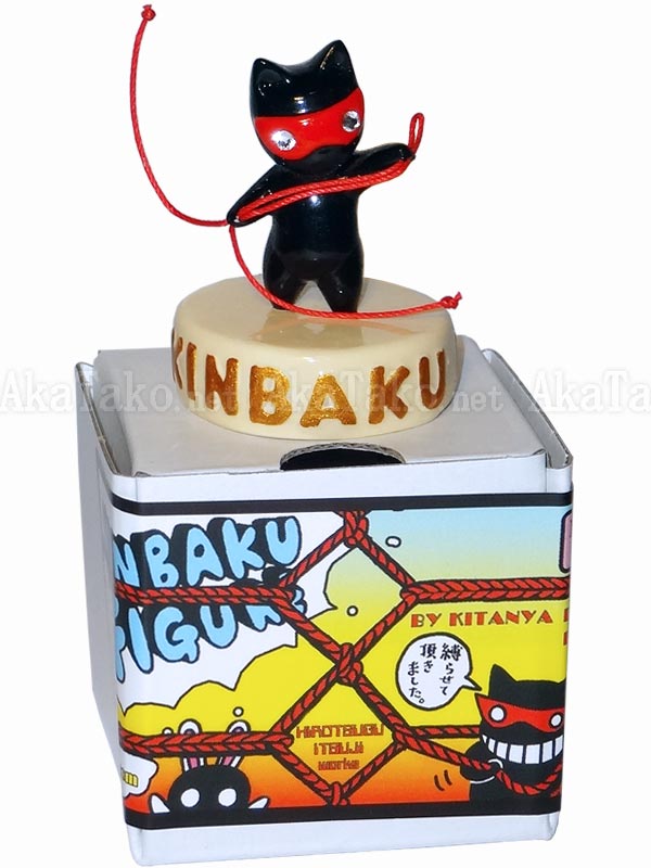 Mini kinbaku master has got just the right length of rope to teach you a lesson! Black kitty cat wears a red mask and has sparkling white eyes. Kinbaku doll handmade in Japan and signed by the artist (in red on back). Comes in a colorful cardboard box (shown in second photo). Hollow base reads "★ Kinbaku Lesson".