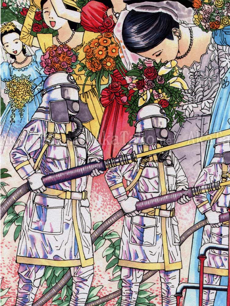Brand new giclée print of "Bride in Front of the Station" by Shintaro Kago. Such a joyful day in a woman's life, the brides in this print are ready for their day - decked out in lace and veils they saw off the groom's head, have their faces bolted into happy expressions, and are ultimately hosed off by a fire brigade.