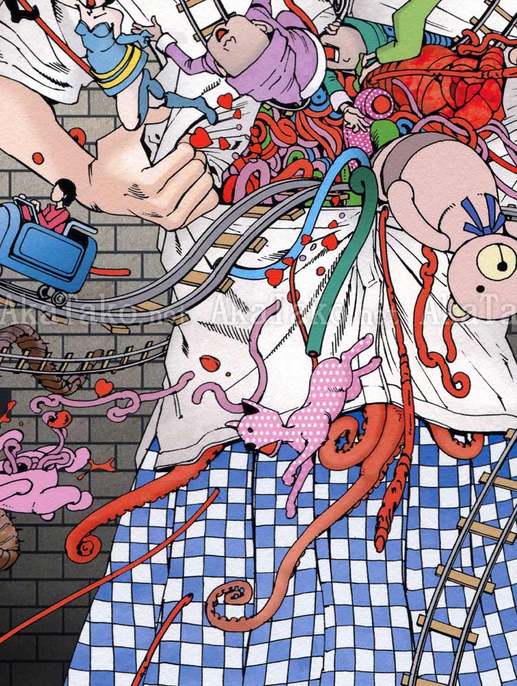 Brand new giclée print of "Murder Art Through the Ages" by Shintaro Kago. A surprised girl pulls at her shirt as a cheerful explosion of train tracks, teddy bears, miniature people, and curly entrails bursts forth.