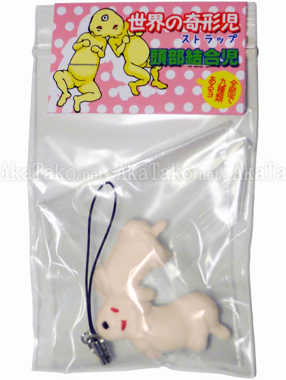 Cell phone strap handmade by Shintaro Kago of a deformed baby. These conjoined twins have two separate bodies but are joined at the head and share one single eye.