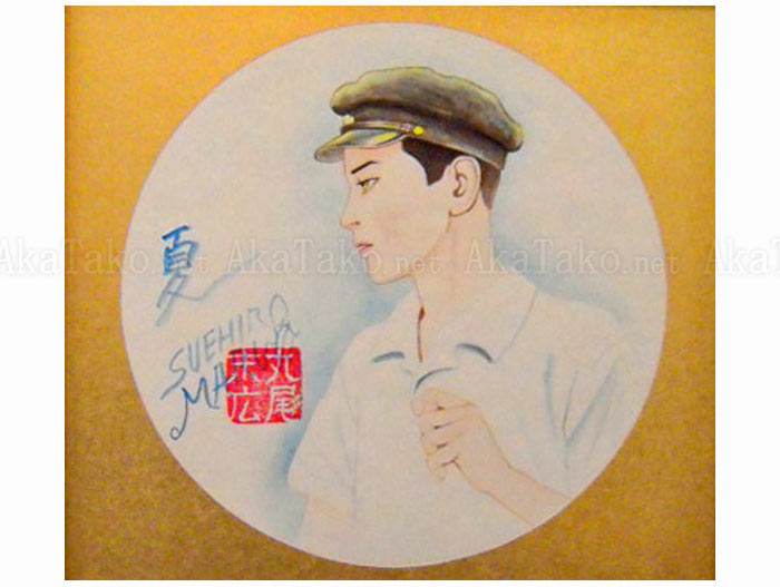Original painting by Suehiro Maruo of the profile of a boy in a white button down shirt and a green cap.