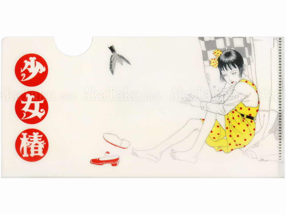 Small size clear folder designed to fit a standard A4 sheet of paper folded into thirds (or paper currency or other documents) features Suehiro Maruo's Little Camellia Girl - Midori. Her red shoes have been kicked off and she sits barefoot in her yellow and red polka dot dress, holding her hand out towards a bird. Monochrome version on reverse.
