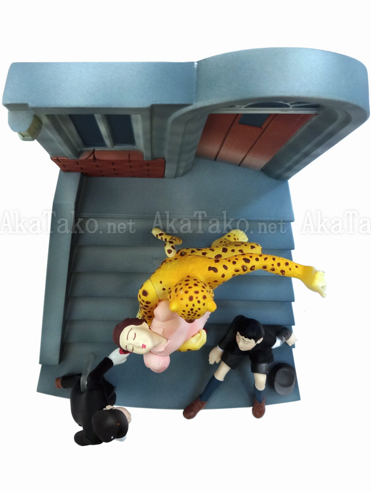 Rare PVC figure of Suehiro Maruo's "The Leopard-man and The Young Detectives". A four-eyed Leopard-man kidnaps a young girl in a pink dress from the front stairs of a house as two young detective boys look on in overwhelmed fear. Comes in original packaging.