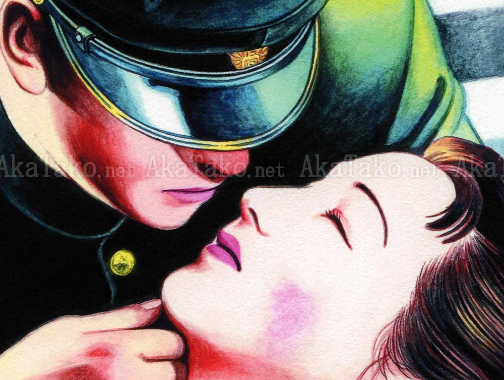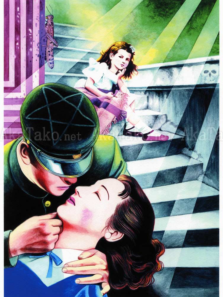 Giclée print of an illustration by Suehiro Maruo for the front cover of the manga "Rose Colored Monster" (Barairo no Kaibutsu). An angry young girl sits on the stairs and watches as a couple is about to kiss. The man wears a uniform with a large star on his hat. Rays of sunlight stream down. The wall on the left is pink and purple striped with a large grasshopper on the edge.