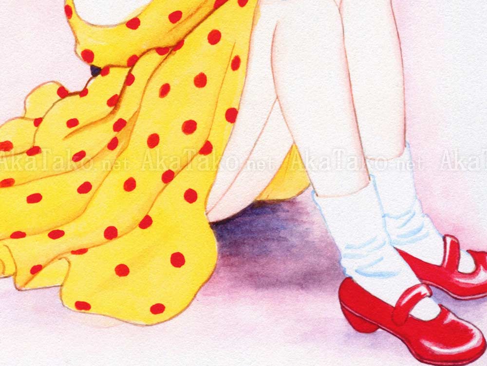 Giclée print of an illustration by Suehiro Maruo of Midori from "Shoujo Tsubaki". Midori is wearing her bright yellow dress with red polka dots with a long sleeved white shirt underneath. Her matching hair bow and shiny red shoes and complete the look. She's sitting on the floor, resting her arms on her knees.
