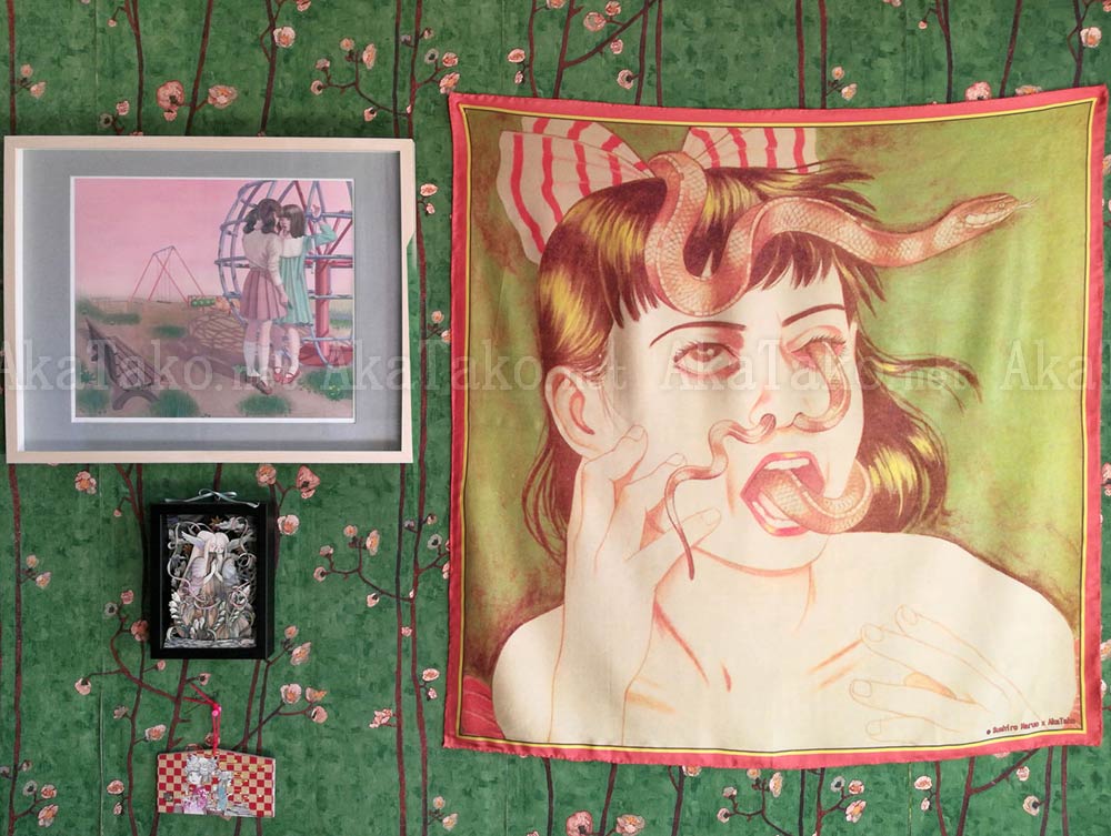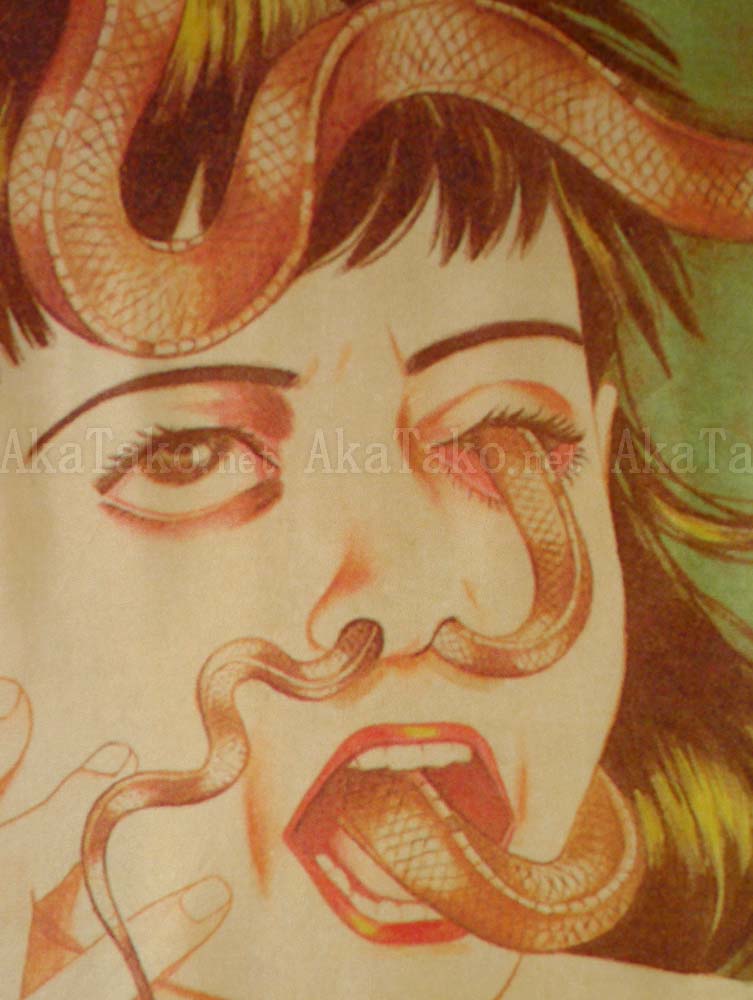Special collaboration between Suehiro Maruo and AkaTako.net ! 100% silk art scarf of one of Suehiro Maruo's most iconic images! A dark-haired girl screams and clutches at her face as s copperhead snake makes its way through her nostrils, into her eye, out of her mouth, and then around the back of her head to emerge between the red and white striped bow on top of her head. Artwork is printed in Maruograph II.