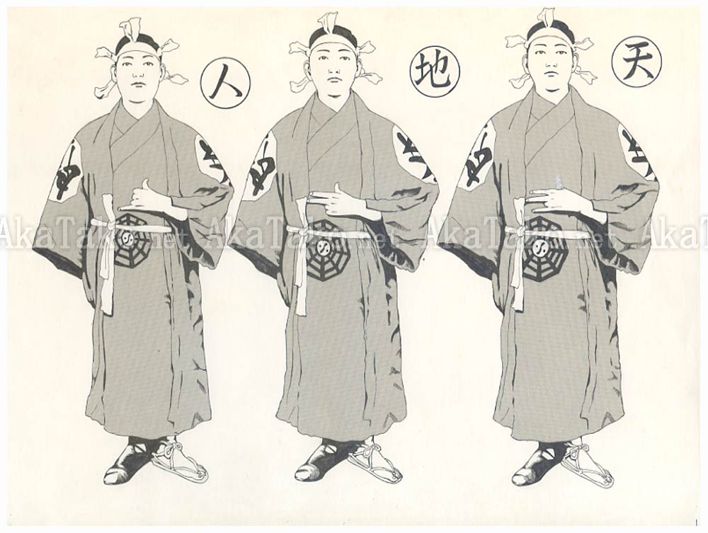 Original painting by Suehiro Maruo of three identical men wearing matching traditional Japanese clothing. There are small differences in their hands and there are three different kanji above each of them to their left.