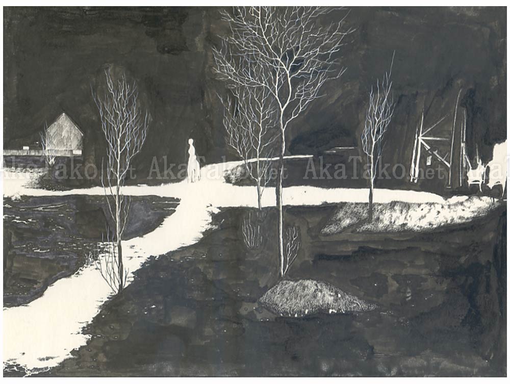 Original painting by Suehiro Maruo of a dark landscape scene. Naked trees sprout from the ground and a pale figure in the distance stands at a crossroads.