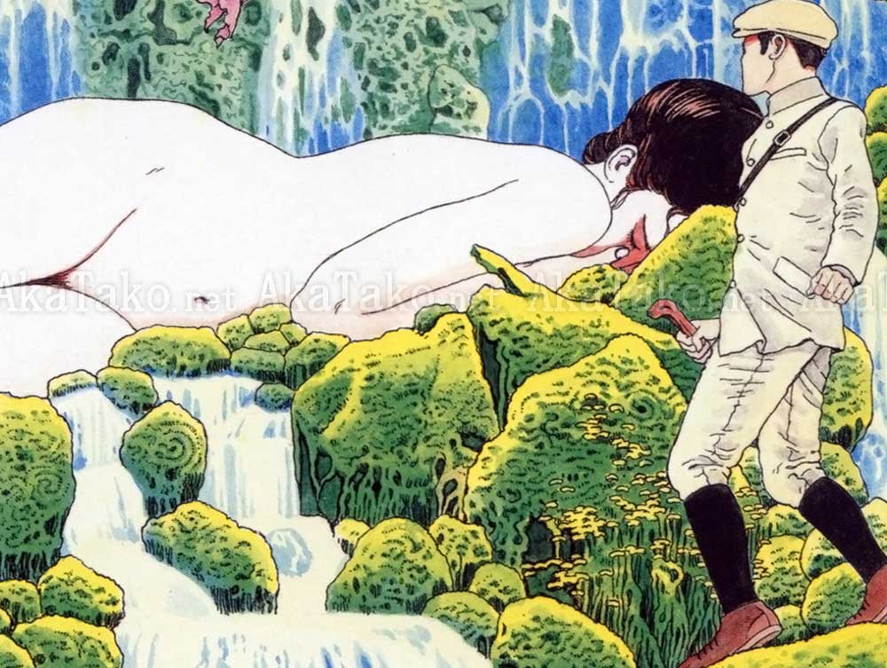 Original painting by Suehiro Maruo of a sparkling waterfall and lush greenery. A boy in a white uniform looks up towards the water. Two nude women float in the top center and a large nude woman lays across the entire painting. A koi fish swims beneath the falls.