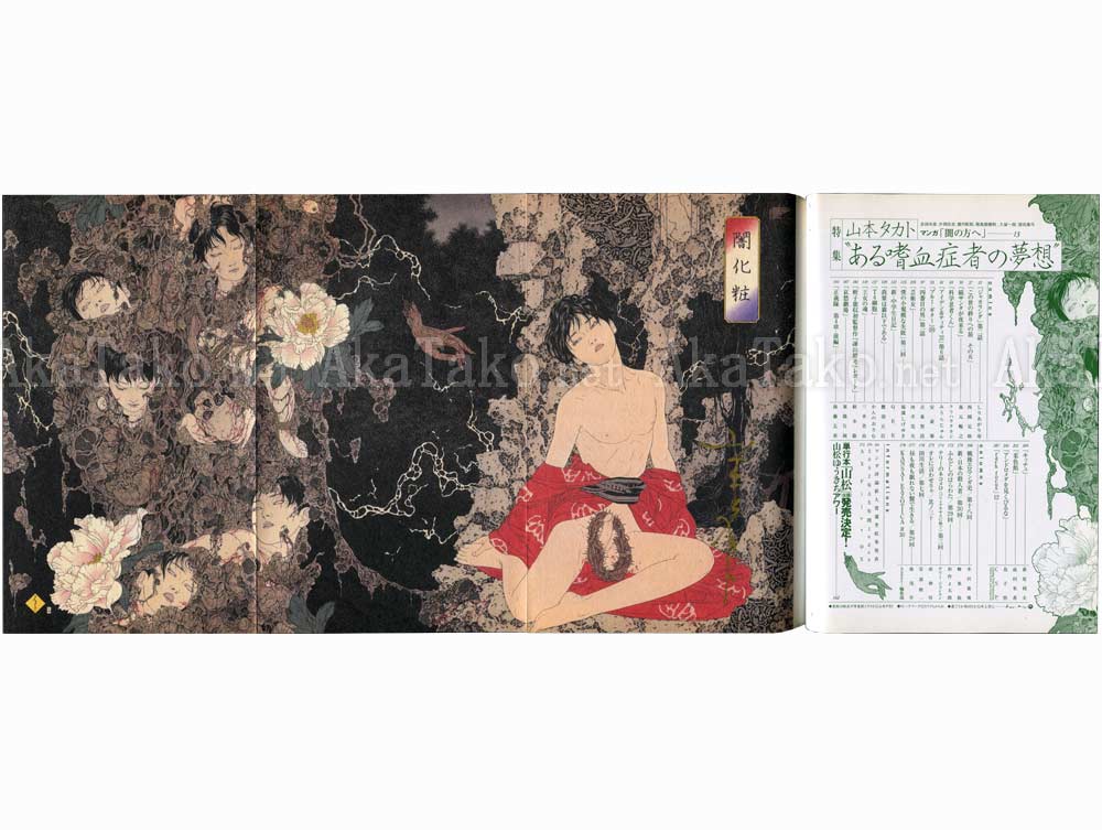 Brand new, never read, Japanese manga アックス (Axe) issue #30 featuring Takato Yamamoto. The cover is a close up of Takato's artwork and there is a three page long fold out, full-color poster (second photo). There is a ten page article on Takato Yamamoto including several black and white artworks, an eight page manga illustrated by Takato Yamamoto (third photo), and many more comics/manga by other artists. You can see the table of contents in the second photo (right side in green ink).