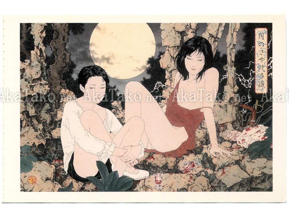Bright Moon Night 月のさやけき夜 - two androgynous people sitting under a full moon in a rocky area, with empty cups of blood, blood spatters, and a severed hand.