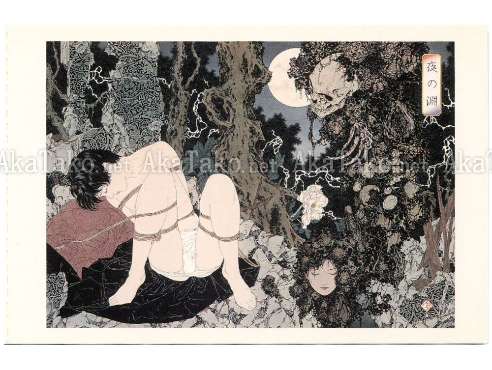 Night Ditch 夜の淵 - a young man bound in rope, a skeleton looming out of the greenery and a disembodied head.
