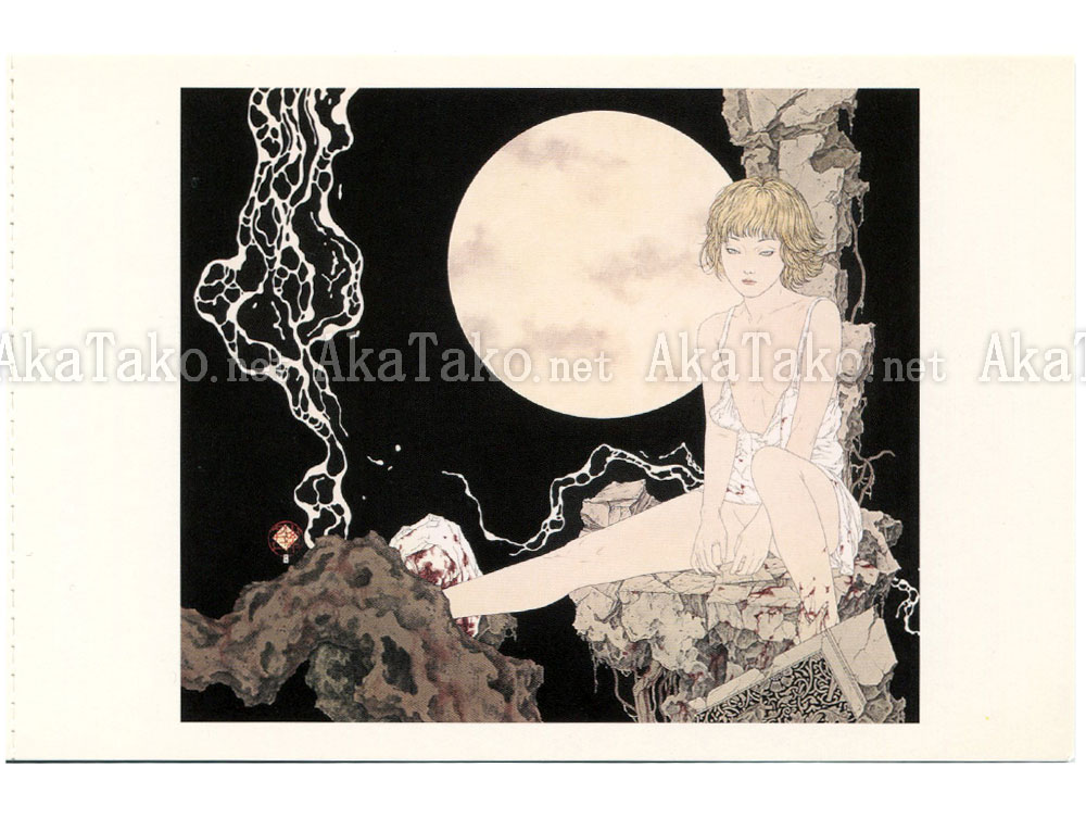A Drop of Moonlight 月の雫 - a young blonde girl (?) sitting on a rocky precipice under a full moon with smoke curling around her; a bloody rag sits near one of her feet.