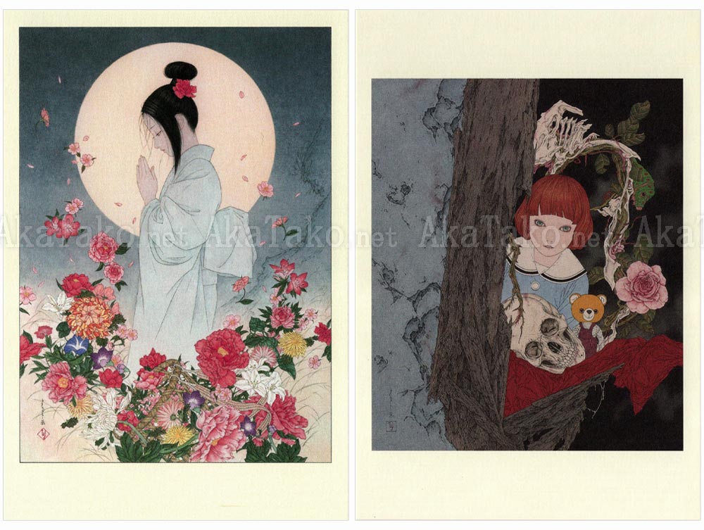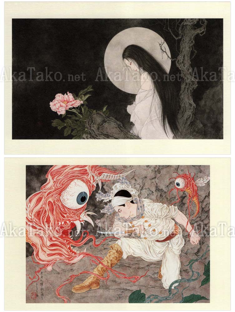 Set of six postcards featuring artwork from "Japonesthetique". Artwork titles are: The Eight Dog Chronicles: The Eight Dog-Heroes in Full Array, Crimson, Picture of A Ghost, In Praise of Hikozo: Eye of the Jaguar, Of Flowers and Herbs: Crimson in the Moonlight, Skull & Little Lucy.