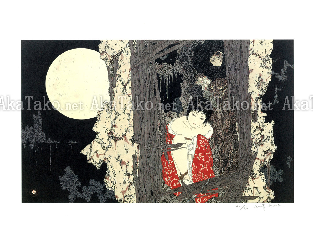 Single print from Takato Yamamoto's original print set 3. Features the work "Servant of the Night" 夜のめしうど which is also reproduced in the Divertimento for a Martyr book.