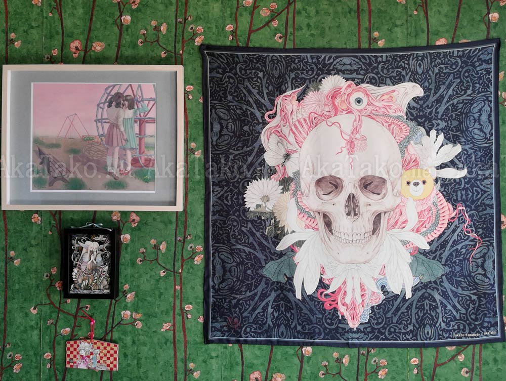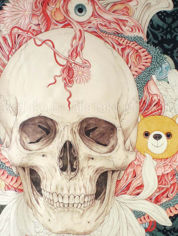 Special collaboration between Takato Yamamoto and AkaTako.net ! 100% silk art scarf of Takato Yamamoto's artwork "The Emblem of Death I". A skull is surrounded by chrysanthemum, bones, and fleshy tendrils. A cheery yellow bear rests on the right side and a white moth on the left while an eyeball rests at the top. Published in "Nosferatu" book.