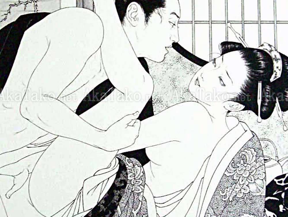 Original painting by Takato Yamamoto titled "Spring Book (Porno Print) - Oishi Kuranosuke III". Previously unpublished. A monochrome painting of a nude couple with their kimonos falling off. They both wear traditional Japanese hairstyles. A circular window is in the background.
