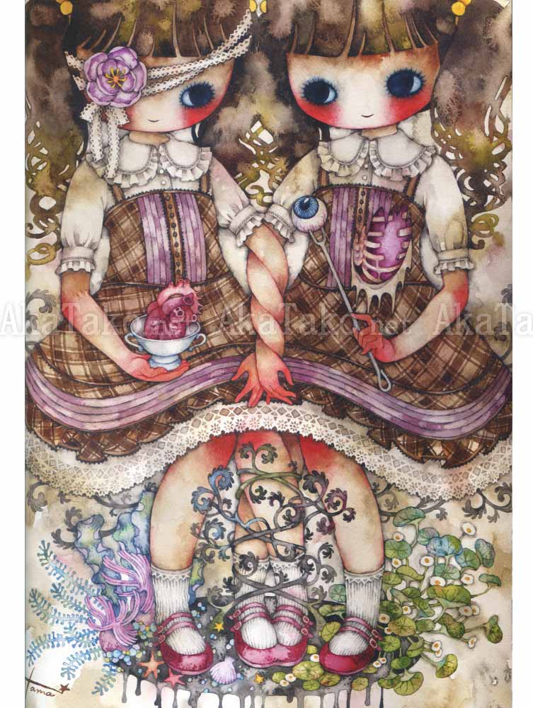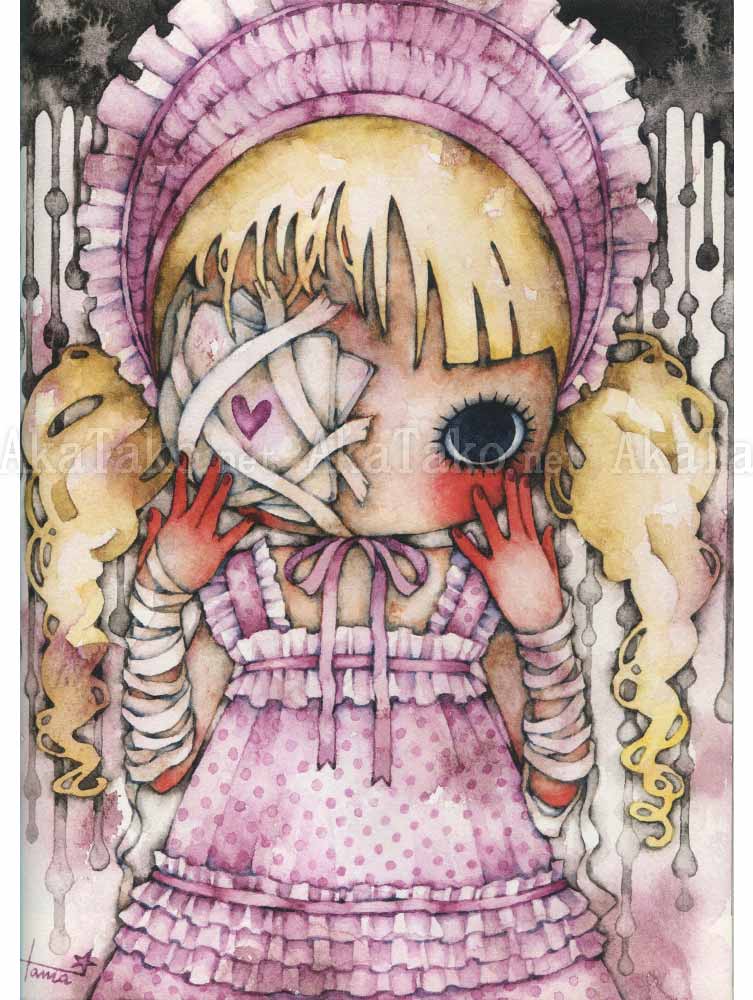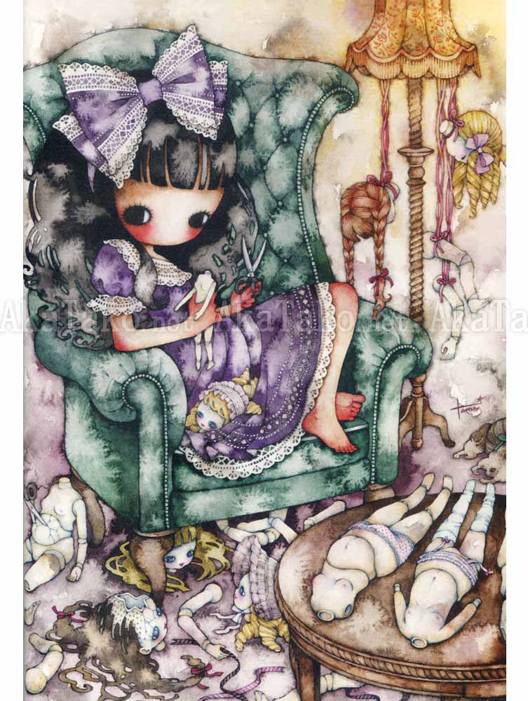 "Ame Iro Romance" (Amber Colored Romance) by Tama has larger format prints of Tama's cute and twisted little girls. Their big heads, curly hair, and oversized eyes draw you in to their surprisingly dark world. Total of 24 full color paintings - many with an accompanying poem in Japanese.