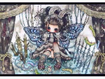 Mini poster print with the artwork "Lager" by Tama. A girl with dark wavy hair sits on the floor. She wears colorful butterfly wings and many caterpillars crawl around her. She has a frilly brown dress on with white lace trim, fishnet tights, and ankle chains that keep her where she is.
