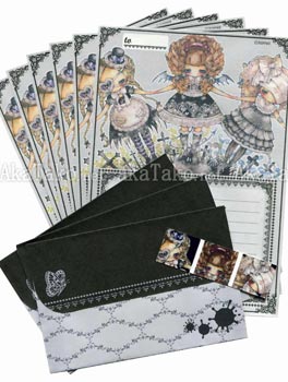 Stationery set featuring "Negaholic" by Tama. Three girls dressed up in their gothic lolita best surrounded by crosses and vines.