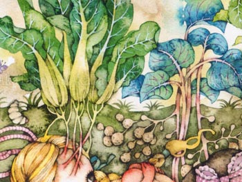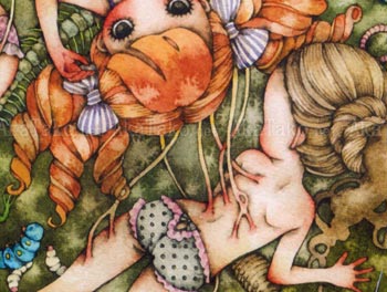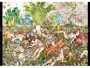 Mini poster print with the artwork "Live and Let Live" by Tama. A group of young girls in frilly underwear are lounging around. They are entwined with tree roots, vegetables, and skeletons. Worms and caterpillars crawl nearby.