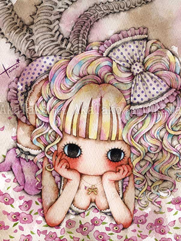 She looks so sweet and innocent but her alien-like tails give hints to her true demeanor! Original painting by Tama features a sweet girl with pastel rainbow highlights in her curly blonde hair. She wears a matching pink and white ruffled outfit with black polka dots. She crouches on her hands and knees as if she's waiting for you to decide to take her home!