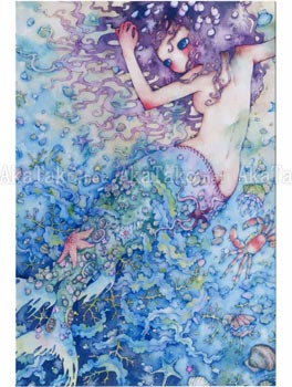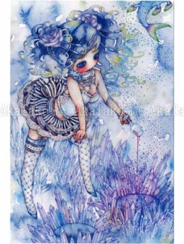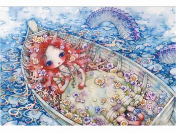Set of four postcards with the cute and dark artwork of Tama. Features four images: Frostbite, Hopeless Mermaid, Amrita, and Rosary.