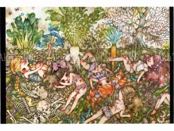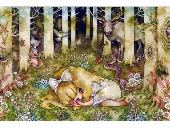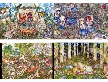 Set of four postcards with the cute and dark artwork of Tama. Features four images: Lunch is Ready, Ritual, Live and Let Live, and Here I Am.