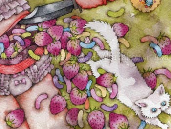 Mini poster print with the artwork "Sham Suicide" by Tama. Little girls cavort and play at suicide with razor blades and knives. Since they are so sweet and cute only strawberries and cookies spill from their wounds.