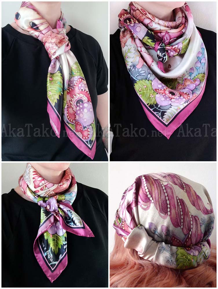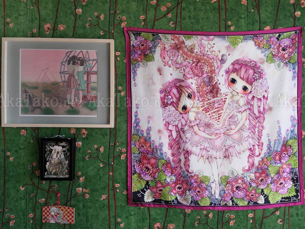 Special collaboration between Tama and AkaTako.net ! 100% silk art scarf of Tama's "Overflowed" artwork but heavily modified to fit into the square format. A pretty ballerina has two heads with long rosy curls. Her body splits vertically in the center and a plume of entrails drift towards the heavens. Carnivorous flowers with spiky teeth and big green leaves surround the edges. Published in "Calling" book or as a postcard.