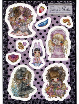 One sheet of sweet lolita stickers by Tama. Sheet includes four of her gorgeous girls plus a slice of pie, some doughnuts, cookies, a caterpillar, and a strawberry.