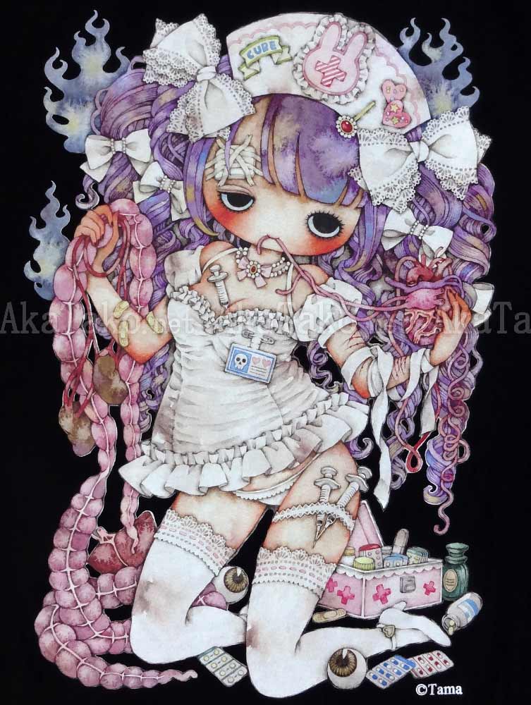 Brand new t-shirt featuring Tama's nurse painting "Hollow Eyes" from her newest book "Calling". This cute nurse holds some entrails in her right hand and a heart in her left hand. She'll still try to make you feel all better!