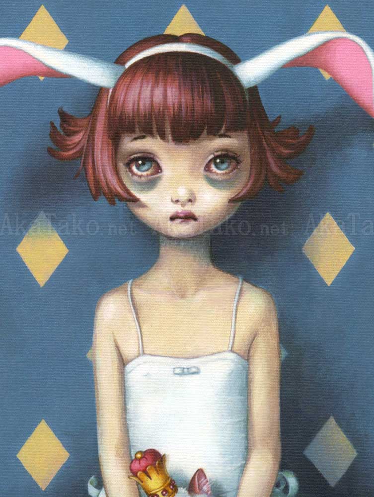 Brand new poster from Trevor Brown's Alice book. Features "Which Dreamed It?" in the center section. A young girl wearing rabbit ears holds a cheshire cat. She wears a white dress and has a forlorn look on her face.