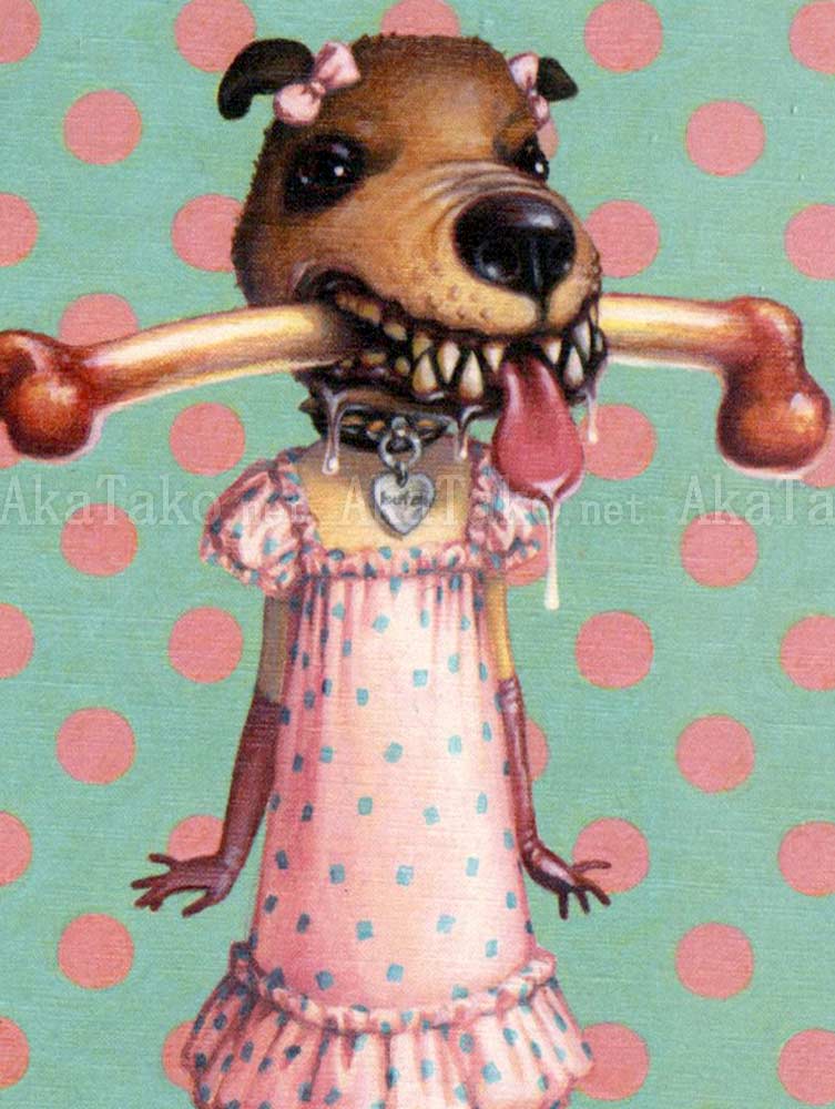 Original painting "Butch" is part of the "Toy Box" series by Trevor Brown. The postcard version contains this rhyme: "a girl on her own / of whom little is known / stay out of the danger zone / give a dog a bone".