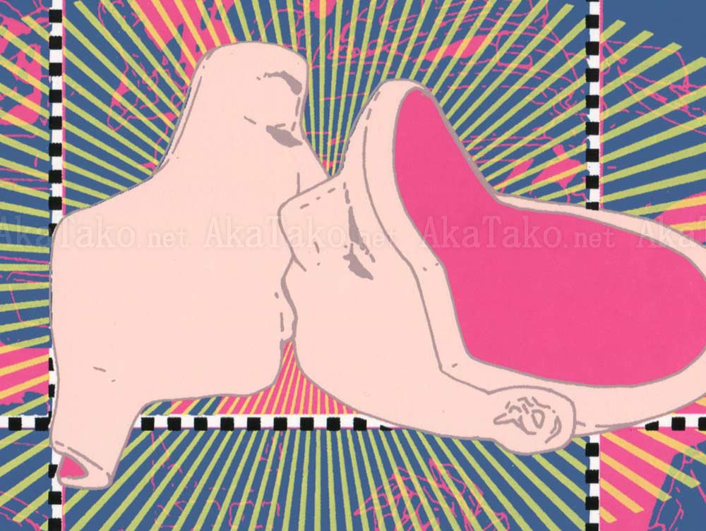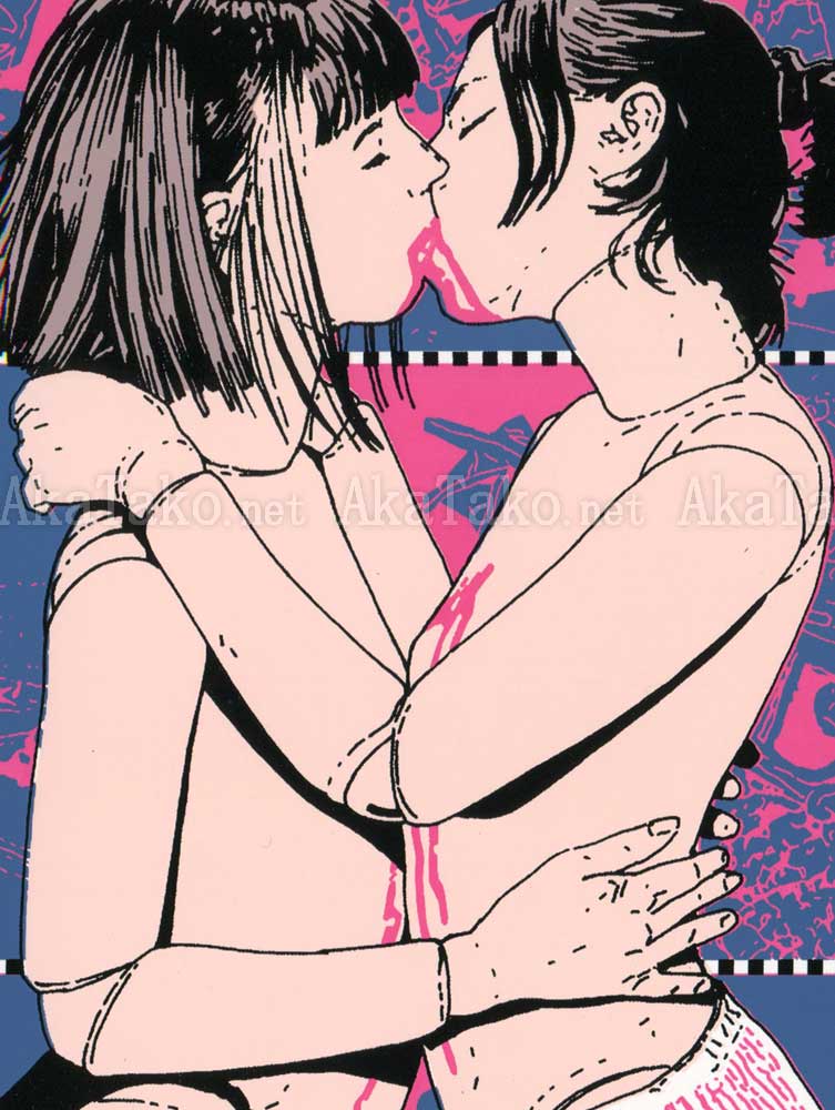 Two ball-jointed girls wearing panties share a bloody kiss in front of a grid of pink and blue car crashes. Print is silk-screen on very heavy weight paper and was produced in 2007. Number 62/160.