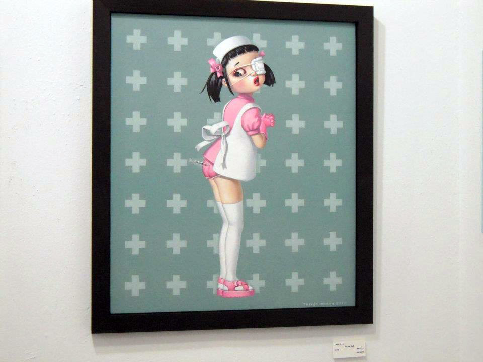 Recently published in the new edition of "Medical Fun", this painting was also featured in the "Toy Box" exhibition (but not included in the postcard set or poster). A sweet young nurse in a pink and white uniform seems to have had a bit of an accident with a syringe! Won't you help her?