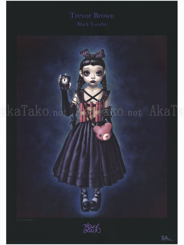 Brand new poster featuring Trevor Brown's "Black Tuesday" which was originally printed in the new book "Girls War". A black haired girl holds a ticking time bomb with sticks of dynamite strapped to her body (alongside her pink teddy bear purse).