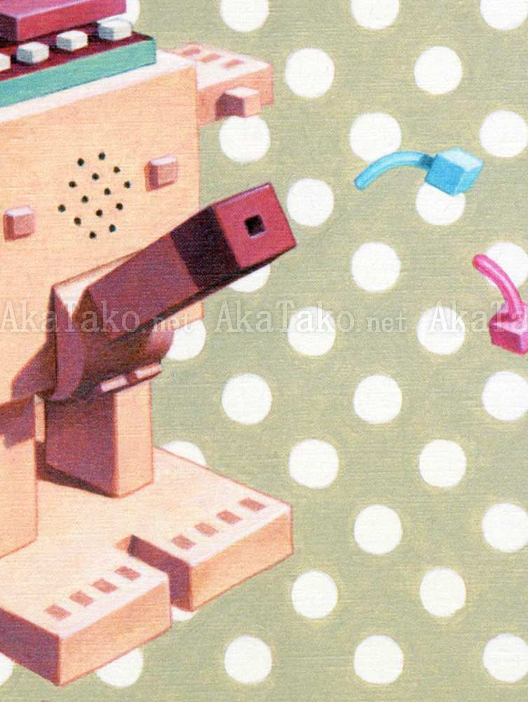 Original painting "Mister Square" is part of the "Toy Box" series by Trevor Brown. The postcard version contains this rhyme: "forty-five degree angle / not a fraction lower / geometric ejaculation of / cuboid spermatozoa.