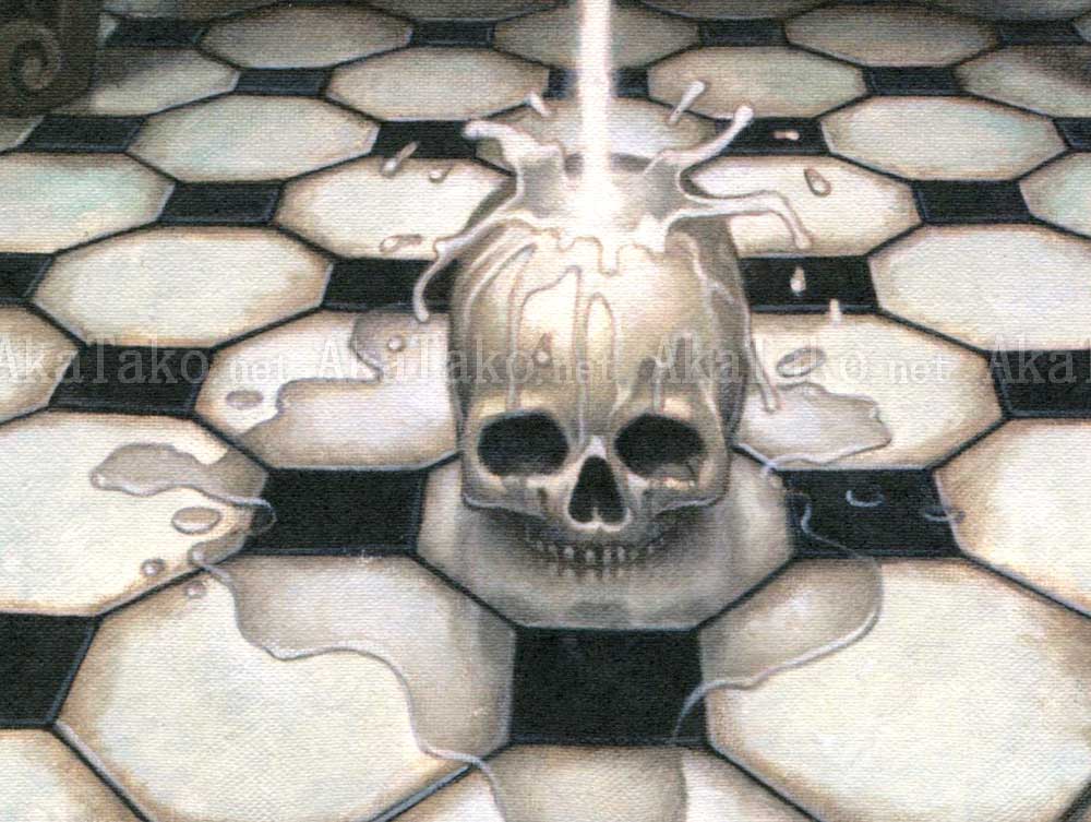 Now's your chance to own a brand new Trevor Brown original painting. A young girl dressed in a black corset with matching gloves, stockings, and high heels crouches on a teal upholstered chair and pees onto a skull on a tiled floor. "Piss Princess" has perfectly curled black hair and a large bow in her hair.
