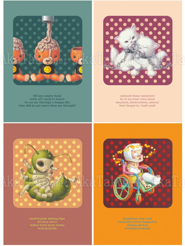 Titles of the paintings are: Iris, Goldfish, Radioactive Rabbit, Taiko, Brains, Monsters, Lora Larva, Broken Doll, Snot n Shit, Love Bombs, Polkadot Bondage, Nurse Bunny, Zelda, Lemon Kitten, Undead, Scribblehead, The Boy Whose Head Exploded, Butch, Mister Square, and Tank Girl.