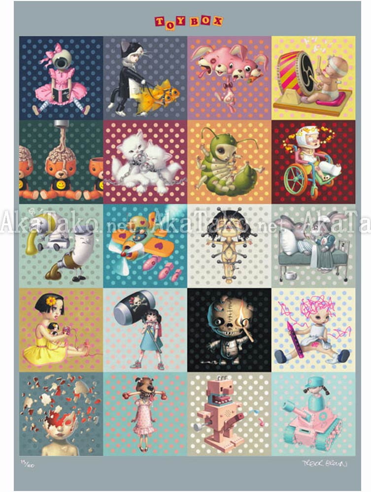 Twenty new paintings by Trevor Brown, tiled together into a sweet and scary poster. Painting titles (from left to right) are: Iris, Goldfish, Radioactive Rabbit, Taiko, Brains, Monsters, Lora Larva, Broken Doll, Snot n Shit, Love Bombs, Polkadot Bondage, Nurse Bunny, Zelda, Lemon Kitten, Undead, Scribblehead, The Boy Whose Head Exploded, Butch, Mister Square, and Tank Girl.