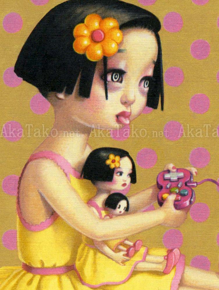 Original painting "Zelda" is part of the "Toy Box" series by Trevor Brown. The postcard version contains this rhyme: "'still playing this?' / she asked me and i telled her / i can't beat the boss / in the last level of zelda".