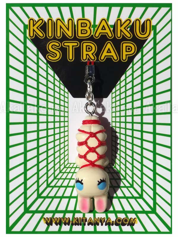 Cream colored bunny is comfortably suspended upside down in criss-cross shibari knots. Kinbaku cell phone strap handmade in Japan and signed by the artist (in red on back). Comes on a paper display card as shown in second photo and has a lobster claw clasp to make attachment easier.