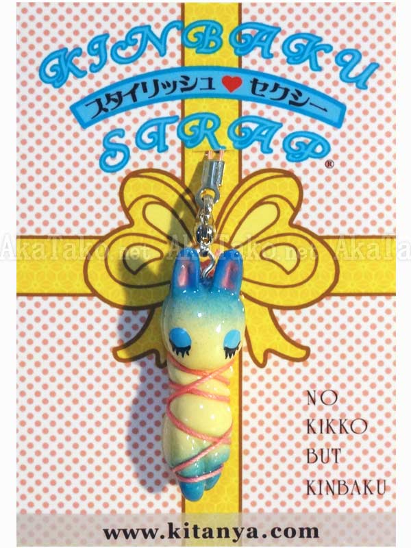This little white bunny has baby blue ears and feet and is tied up in an irregular kikko pattern of pink rope. Kinbaku cell phone strap handmade in Japan and signed by the artist (in red on back). Comes on a paper display card as shown in second photo and has a lobster claw clasp to make attachment easier.