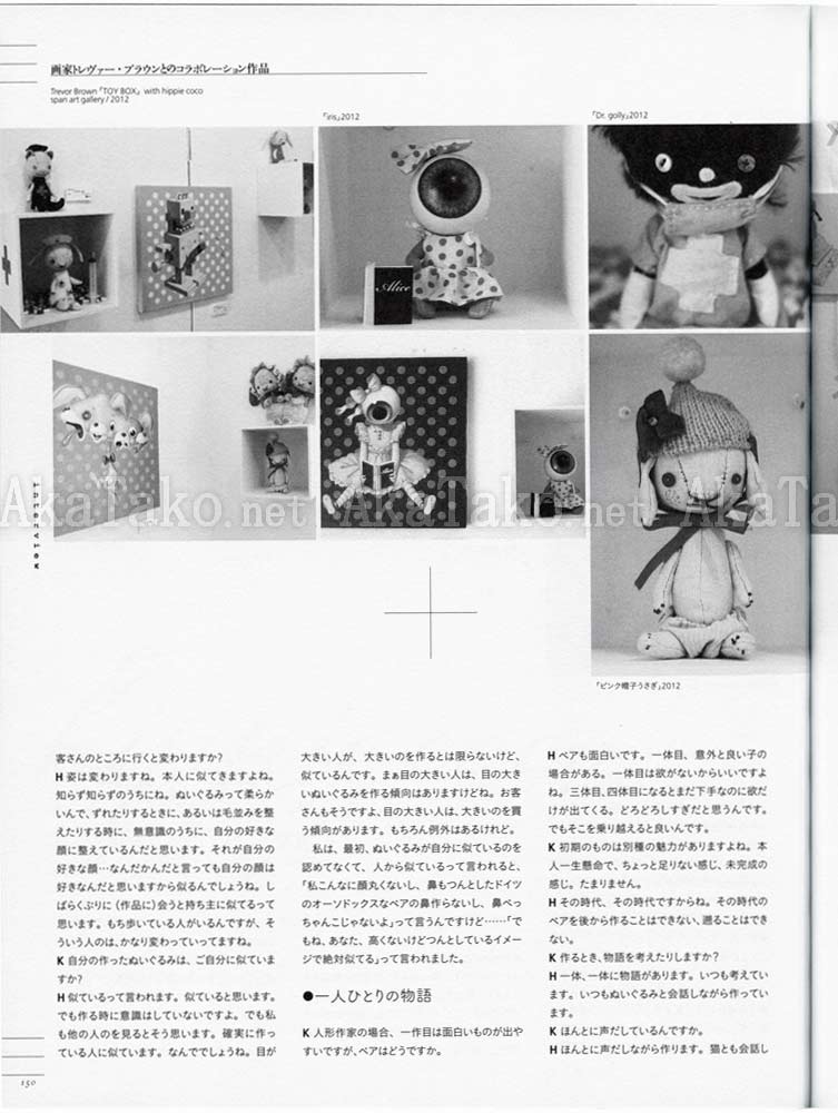 Yaso Japanese art magazine filled with stuffed animals - ぬいぐるみ. These are not the cute little fuzzy creatures that you grew up with. Yaso presents a wonderful collection of stuffed animals that are a little scary, odd, weird and still cute. Most notable is a 10+ page spread featuring Hippie Coco (Trevor Brown's wife) and photos from their joint "Toy Box" exhibition. 99% color with only a few pages at the end that are black & white.