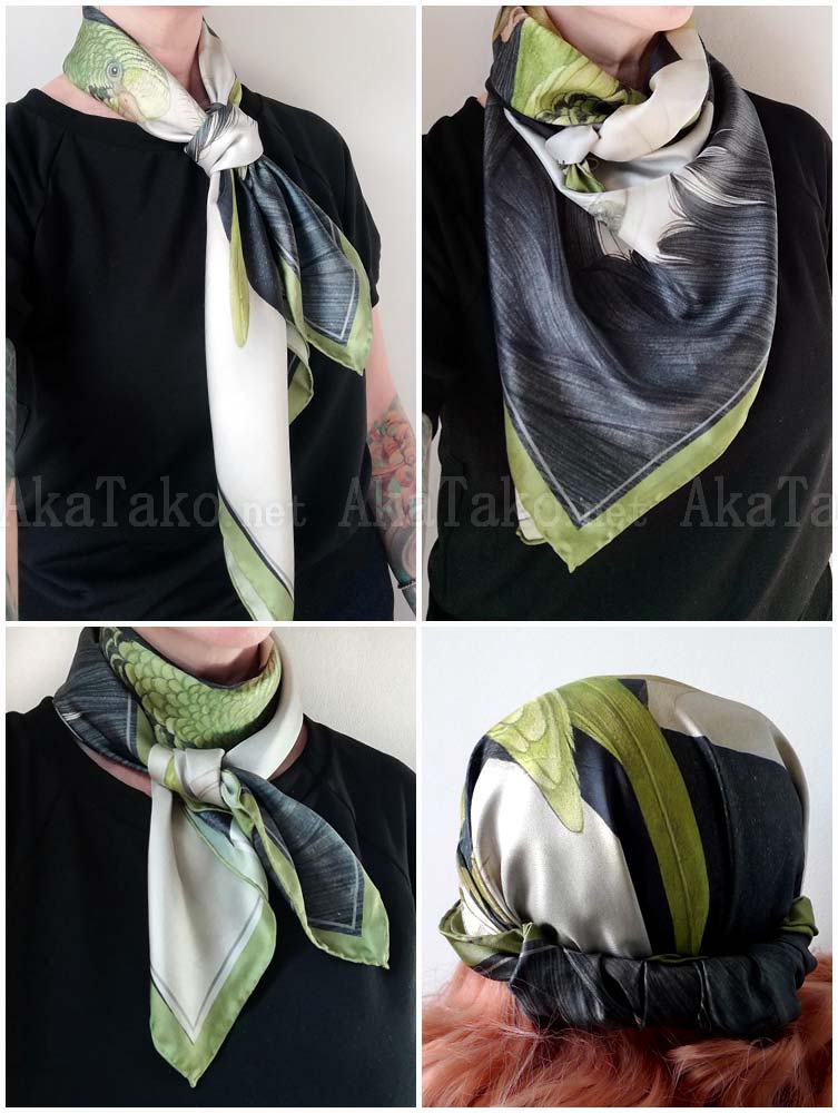 Special collaboration between Chika Yamada and AkaTako.net ! 100% silk art scarf of Yuka Sakuma's artwork "Last Flight". A pale girl with dark hair holds a twig looped with golden ribbon. A green parakeet rests on the twig and looks backwards towards the viewer. Published in "Shine" book.
