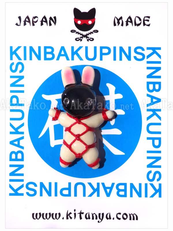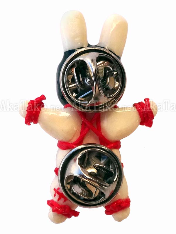 Cream colored bunny with black mask has arms spread wide! Reverse of pin has two "tie tack" type of pins with butterfly clasps. Kinbaku bunny pin is handmade in Japan and signed by the artist (in red on back). Comes on a paper display card as shown in second photo. More info on Kitanya.