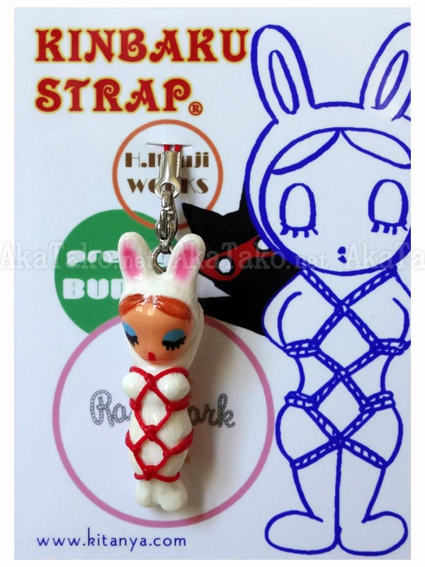 Pretty lady wears a white bunny costume complete with ears. Kinbaku cell phone strap handmade in Japan and signed by the artist (in red on back). Comes on a paper display card as shown in second photo and has a lobster claw clasp to make attachment easier.