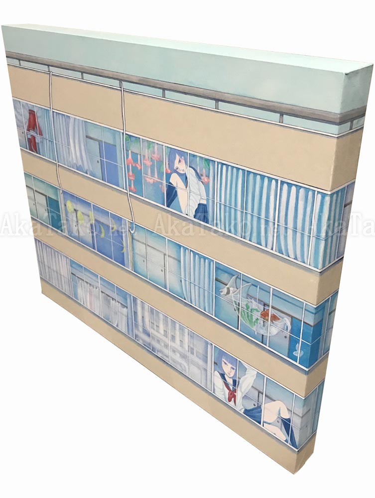 Original painting by Chika Yamada of three floors of a building. Peeking through windows we see an industrial smoke stack, a school girl hiding in lily flowers, phases of the moon, a flying manta ray, a goldfish swiming in a clear umbrella, laundry drying, industrial pipes, and a school girl looking out the window.